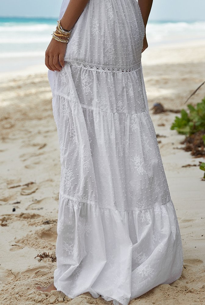 • A maxi-length dress in white, with straps, made of delicate, flowing fabric. The dress is decorated with delicate lace.