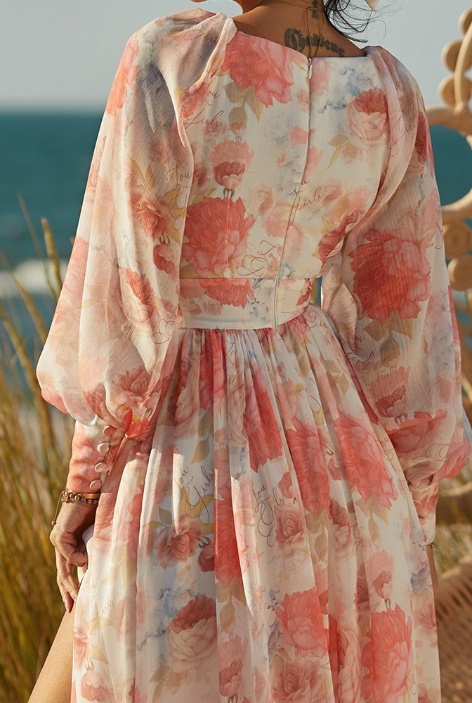 • Rosario - a maxi length dress made of airy, delicate, logged "Lou Girls" fabric, in shades of orange and red with a floral print. A dress with a V-neckline and long sleeves with decorative buttons. On the back fastened with a zipper.