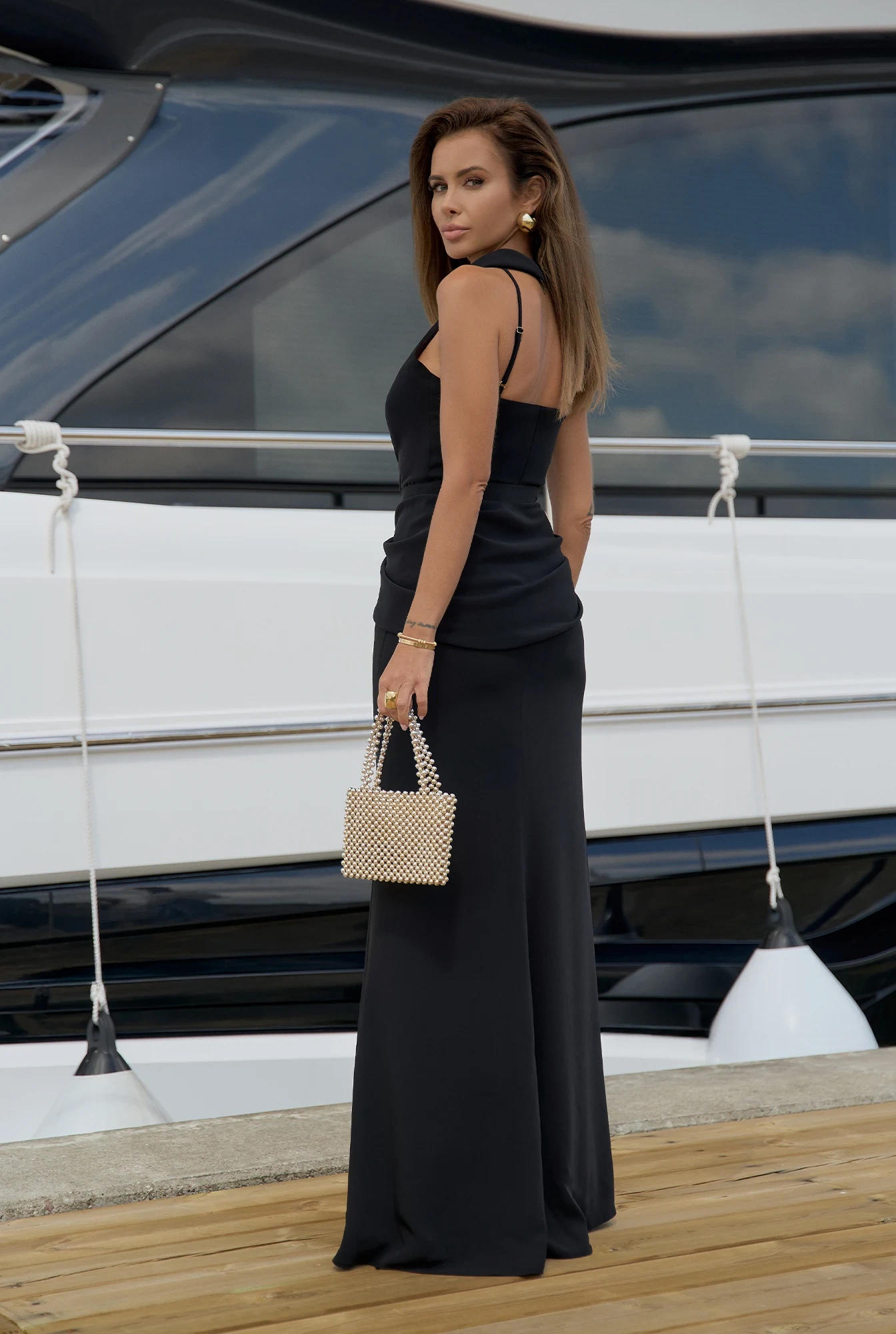 Anora is a long black dress that impresses with its classic cut, subtly accentuating the silhouette. The top features a high halter neckline that beautifully highlights the shoulders and neck. A sensual front slit adds lightness and ease of movement. At the waist, there is a decorative detachable train fastened with delicate buttons – wear it for a wow effect, or remove it for a more minimalist look. The dress fastens with a zipper and is lined with a soft viscose lining for added comfort. A perfect choice for a gala, elegant wedding, or special evening.