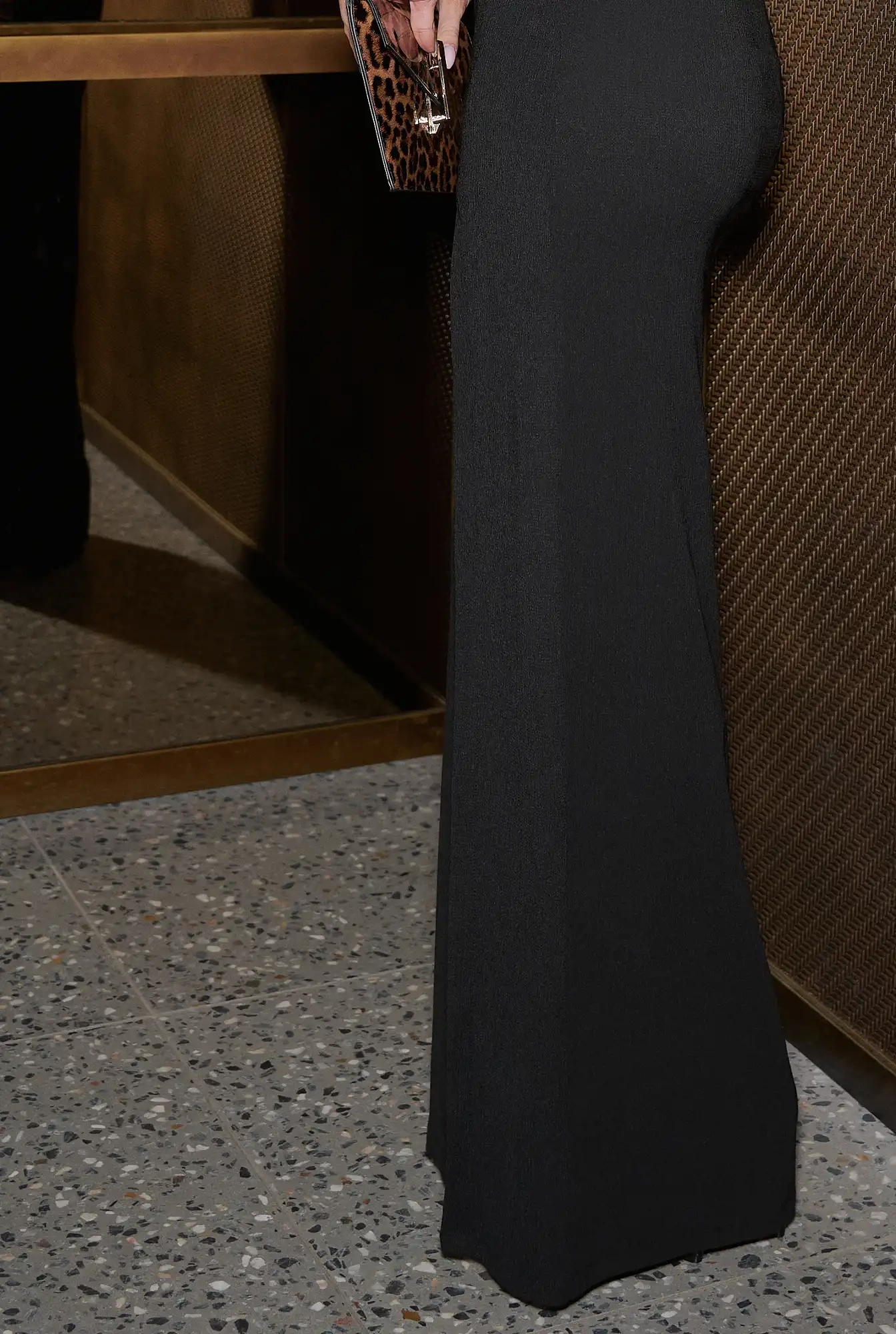 • Black dress with a stand-up collar and left-side slit. Made from stretchy fabric, with shoulder pads and a zip fastening. A timeless, elegant choice for special occasions.