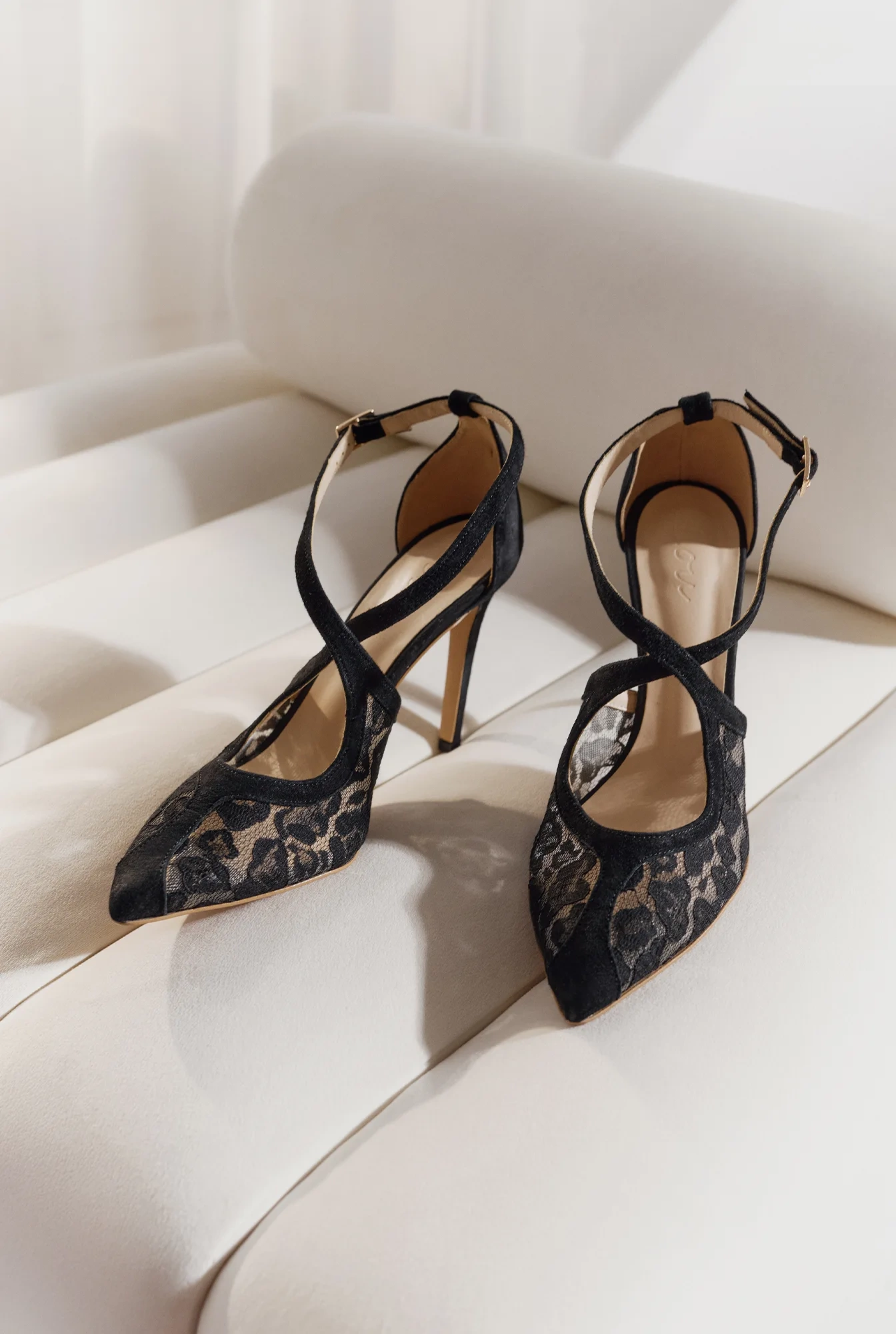 Chiari are elegant black heels made of soft suede, adorned with a delicate lace detail. The adjustable strap that crosses over the ankle emphasizes the foot’s shape and ensures stability. Made from natural materials, they guarantee comfort for hours of wear. The slender 10 cm heel adds lightness and feminine charm – perfect for special occasions and evening outings.