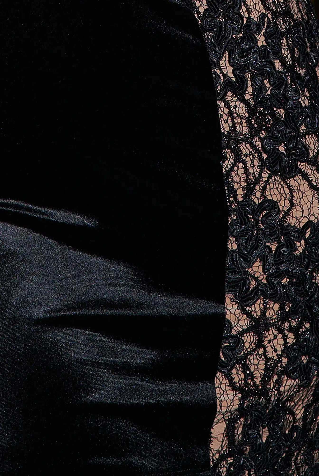 • Mini dress with a lace insert and contrasting lining. Made of stretchy velvet fabric. Shoulders with sewn-in pads. Zip fastening.