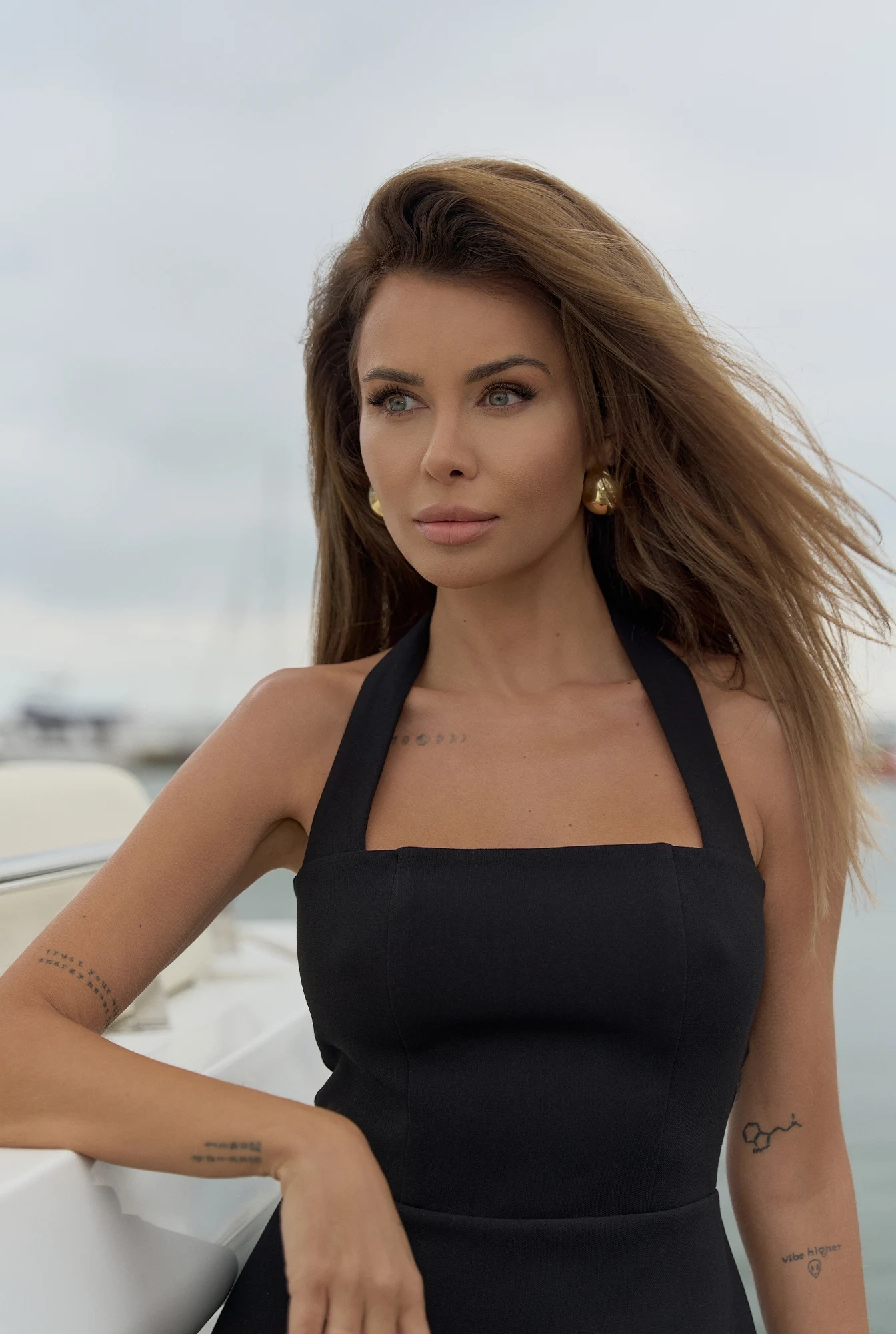 This stylish mini dress with a neck tie combines girlish charm with elegance. Made from viscose-blend fabric, it ensures wearing comfort. The skirt is slightly flared and stiffened, adding lightness to your silhouette. Fully lined with soft viscose lining for perfect drape. The dress fastens at the back with a buttons and zipper.