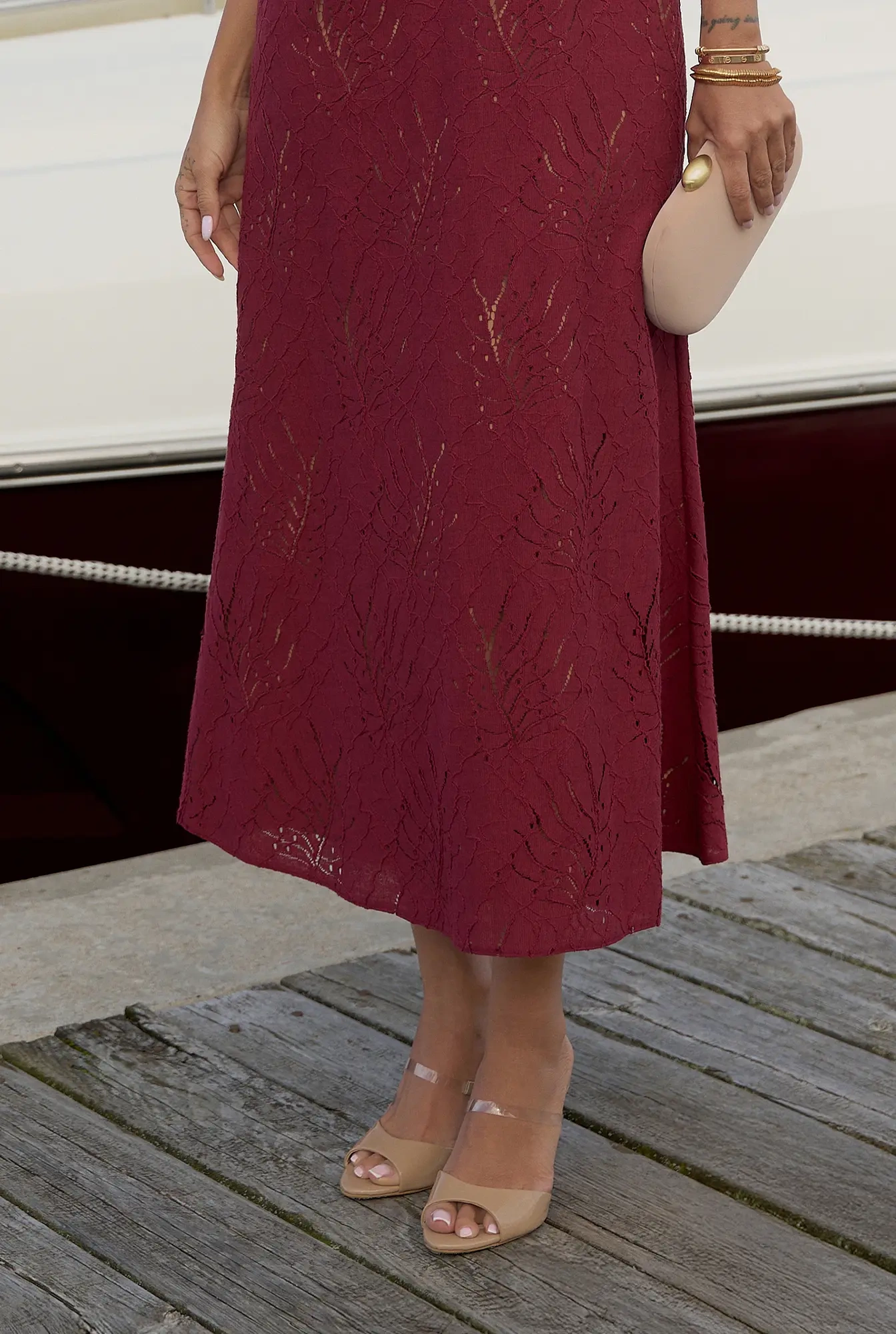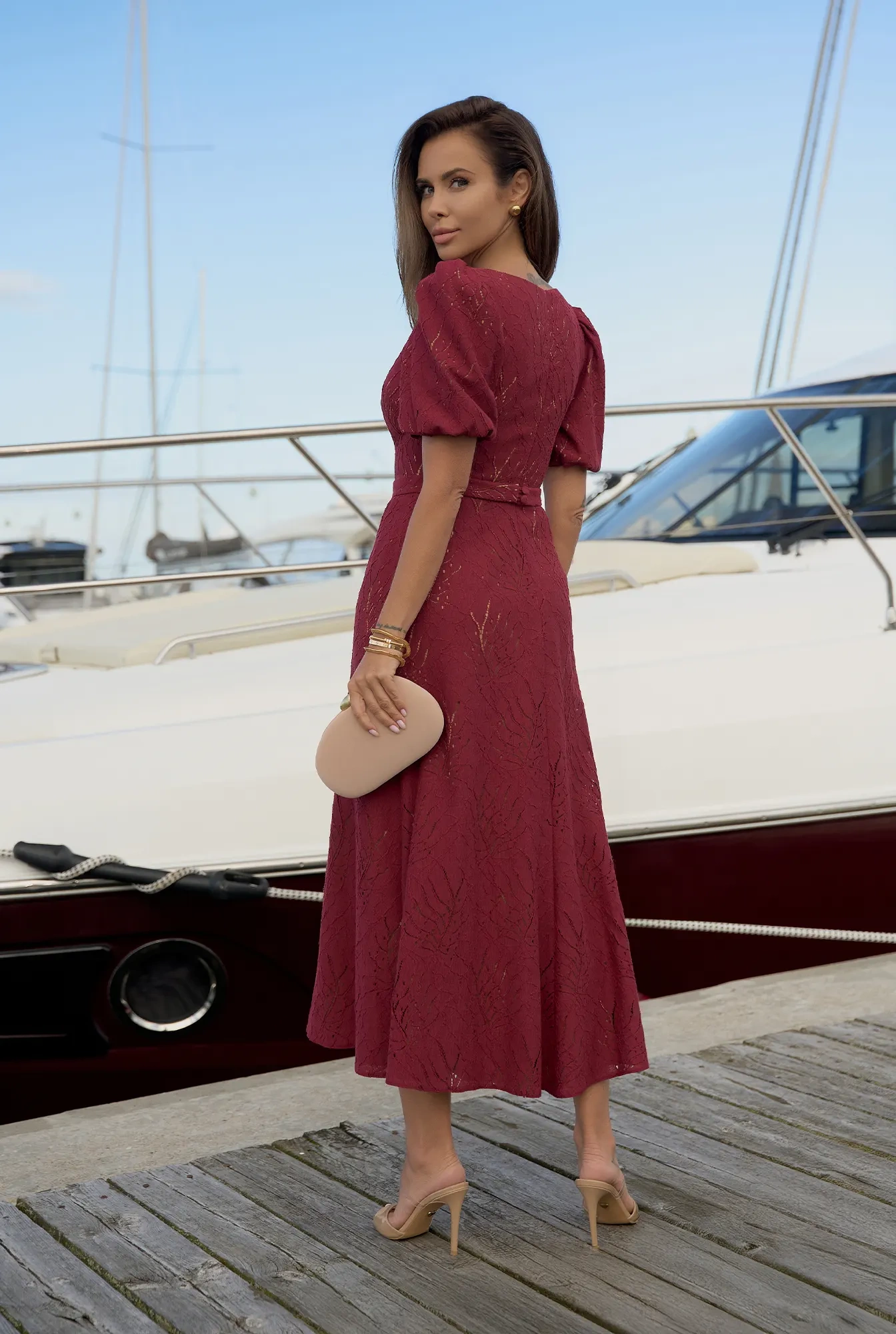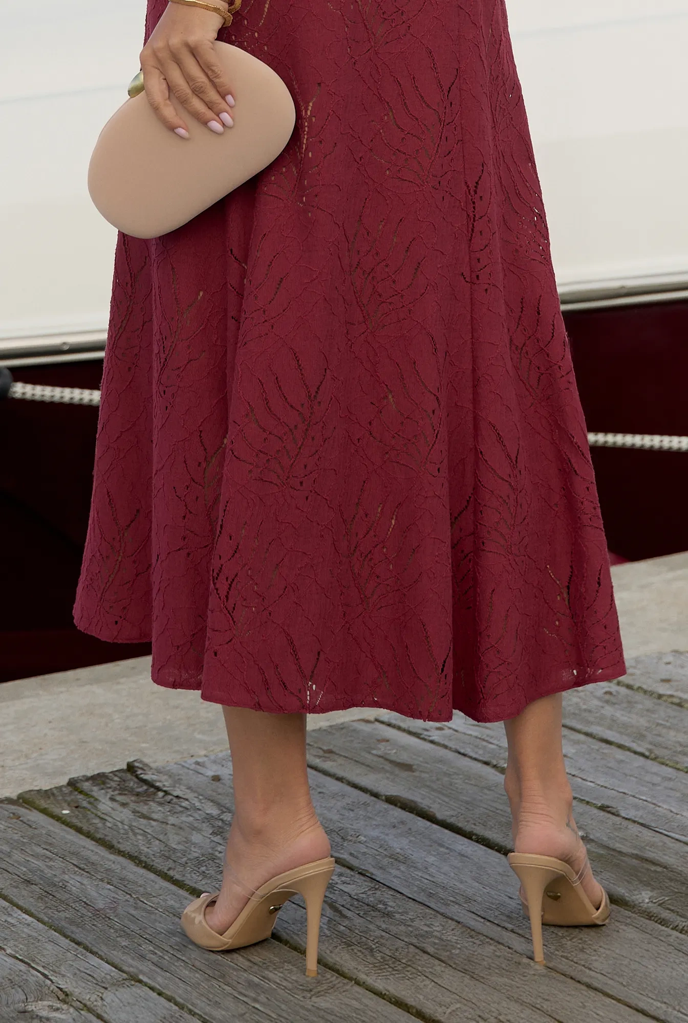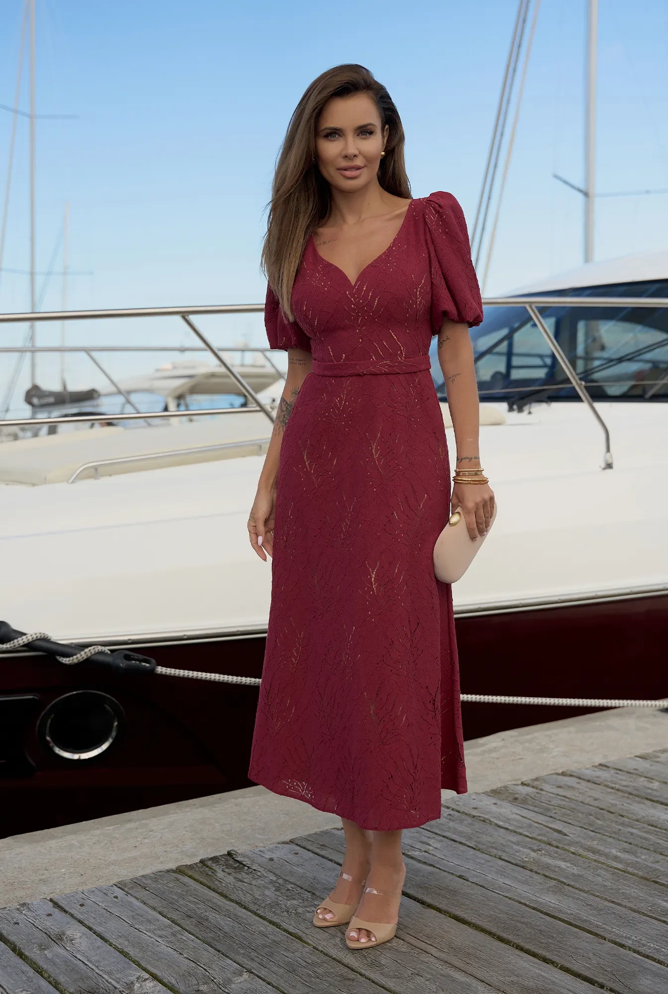 Hover is an exceptional burgundy midi dress made of delicate openwork lace, adding lightness and a romantic character. The Elastic cuffs provide comfort and subtle finishing, while the zip fastening makes it easy to put on. The entire dress is carefully finished with a lining, ensuring comfortable wear.