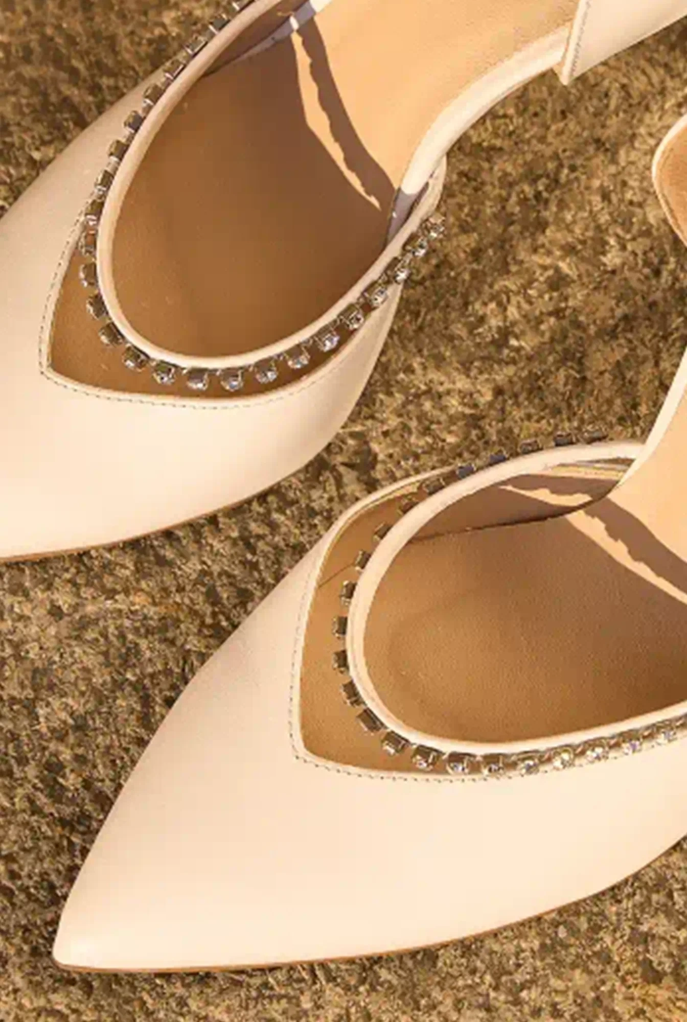 • White stilettos with a decorative strap. Made of natural leather, decorated with a band of zircons. The sole is made of tuniscus leather. The height of the heel is 10 cm.