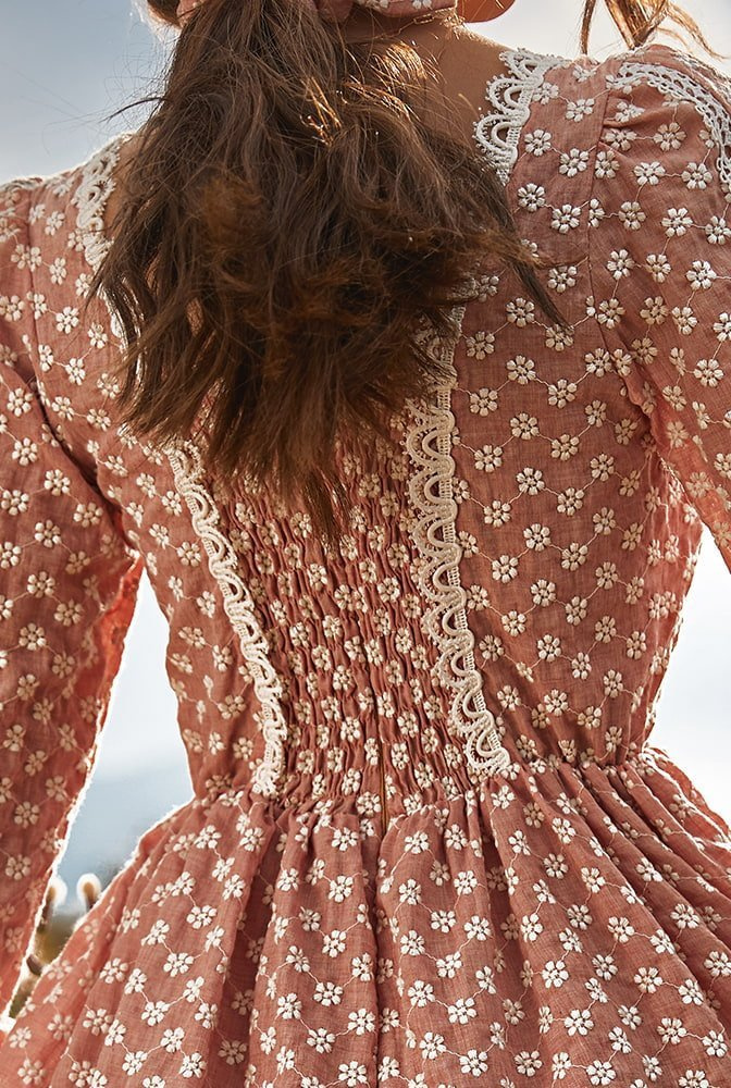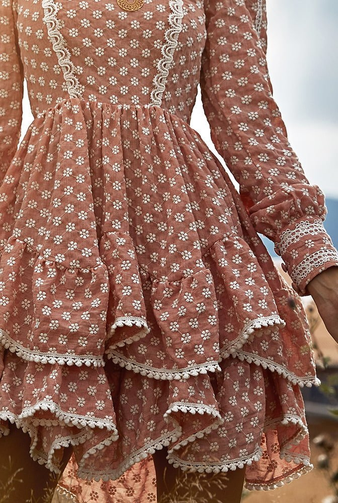 • A boho style long sleeve dress in a brick shade with beige, subtle lace. Loose sleeves, decorative frills. The elastic on the back allows for a better fit to the body. Fastened with a covered zipper.