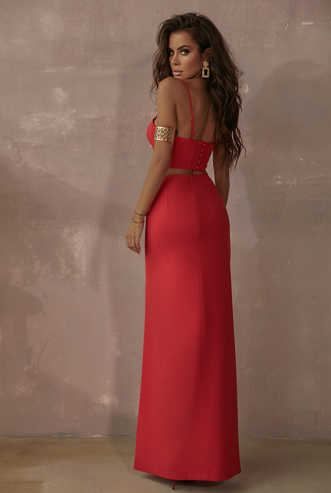 A simple pencil form in a juicy shade. The maxi skirt length gives an elegant character to the whole composition. Good quality fabric provides comfort and style. Lining made of the same material as the whole set. The underwired corset is fastened at the back with small buttons, and an additional advantage is the possibility of unfastening the straps. The Donna set is the perfect idea for exquisite celebrations. Beautiful, classic stiletto heels and glittering jewellery will go fantastically with the red of the set. Choose black or red and enjoy exceptional elegance at its best.
